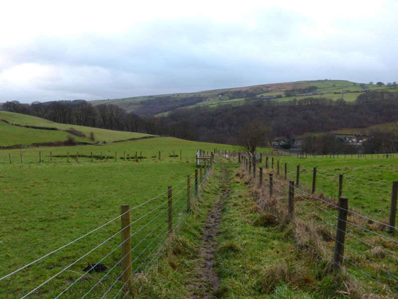 Two rather different housing styles; what the older houses lack in height, they make up for in chimney heights. Our path led down behind these houses and into Luddenden Brook.