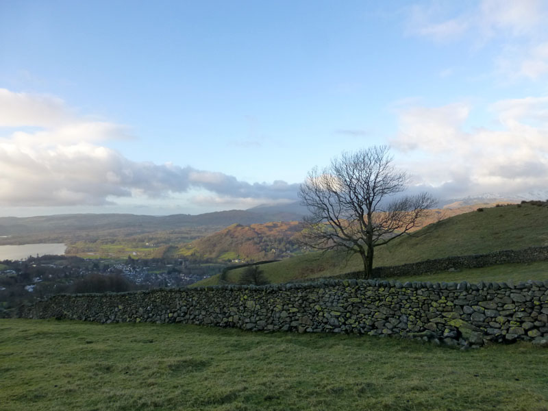 Early morning views towards Windermere and Loughrigg Fell. Also, on the right is the walled track towards Snarker Pike, which sits on the shoulder of Red Screes.