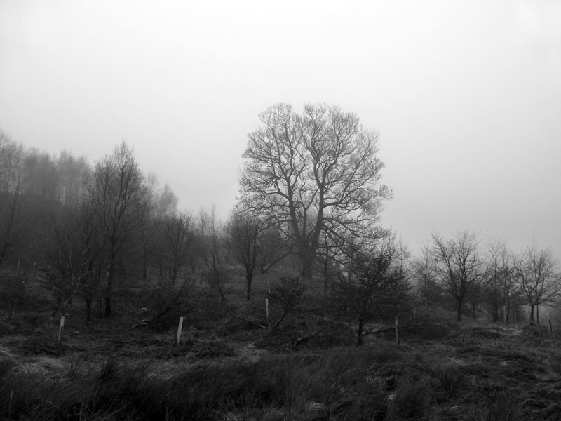 It's a very misty, murky morning (2nd March 2014) and there's no point going any higher. A path leads eastwards from here, under the dramatic crags of Thievely Scout.