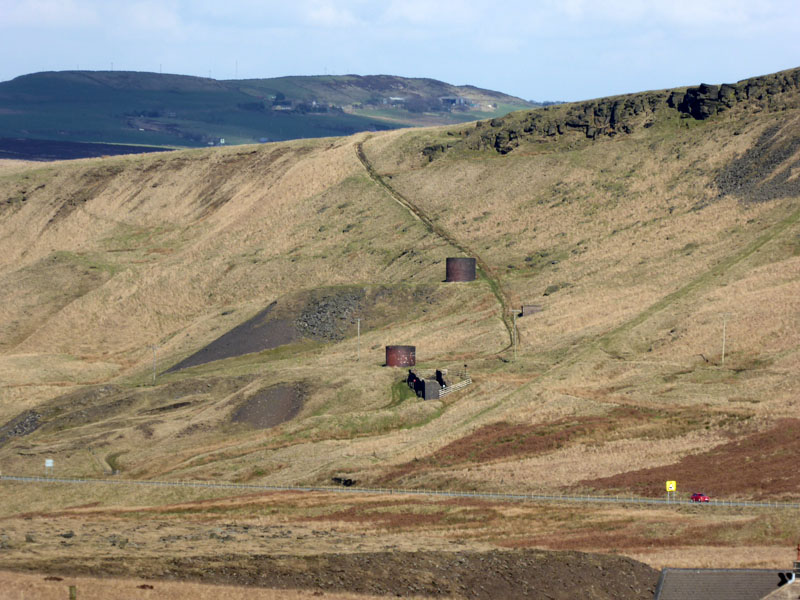 Air shafts relating to the Standedge Tunnels are seen on Pule Hill. An abandoned dwelling is seen below Brun Clough Reservoir.