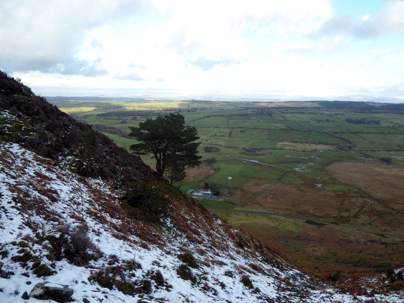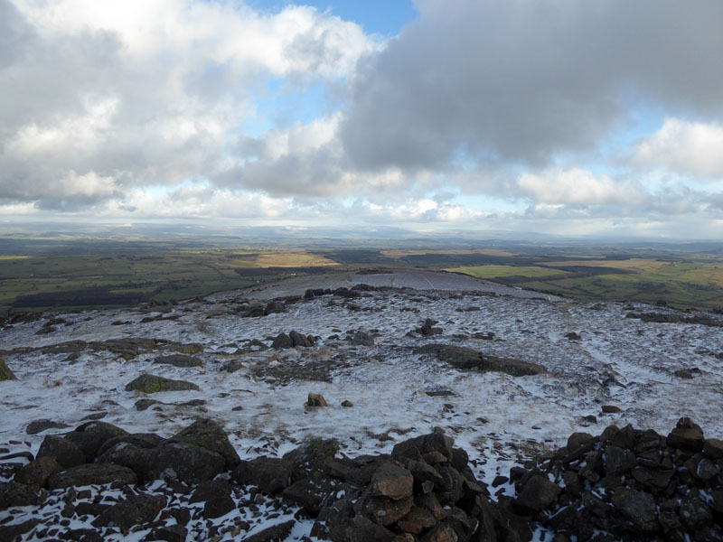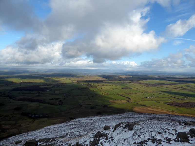 This view to the east from the east peak extends to the North Pennine fells and the ordered fields of fertile farmland lie in the near ground. It's quite a steep descent from here, the path quite easy to find.