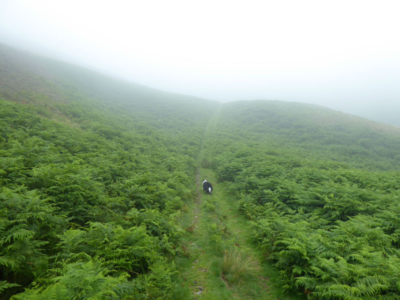 Ideal for bracken enthusiasts. It wasn't long before we spotted cow dung on the path and in the murk was a herd of Belted Galloways. My limited experience of these cows is that they are fairly placid, we gave them a wide berth and proceeded safely to Trusmadoor.