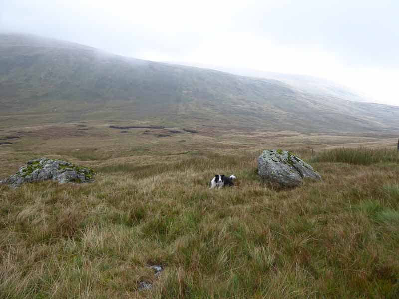 I am on a boulder and Molly is between a rock and a hard place. The fellside ahead is Selside Brow, leading to Branstree. We will go into the dip and take a right for Mosedale.