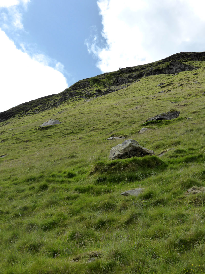 There is an untidy "ditch" near the summit and its origin is unclear. Now, I'm no expert in such matters ... but, if I was building a long, high stone wall over a fellside, I'd look for my raw material as close to the site as possible and hence I wonder if the "ditch" is actually a quarry?