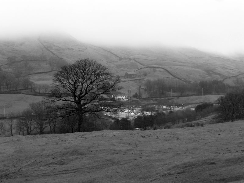 It's a very misty, murky morning (2nd March 2014) and there's no point going any higher. A path leads eastwards from here, under the dramatic crags of Thievely Scout.