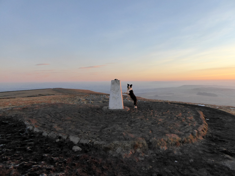 07:00hrs start for the pre-work climb up Pendle Hill from the roadside. The day before, Molly stretches her legs on the fields behind our house with Pendle Hill in the background. On the day, the orange hues gather 30 minutes before sunrise.