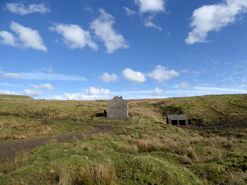 Air shafts relating to the Standedge Tunnels are seen on Pule Hill. An abandoned dwelling is seen below Brun Clough Reservoir.