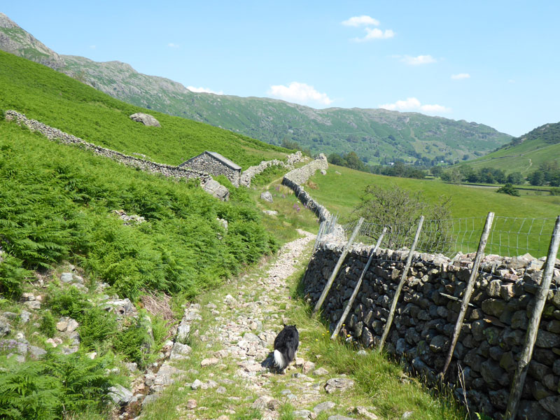 There has been a winter and a summer solstice since my last day trip to The Lakes. Today's walk starts from the Sticklebarn NT car park in the Langdale valley at 0710hrs. It will be sunny and hot according to the weather forecasts, so I have chosen a route with many water features to allow Molly to keep hydrated and as cool as possible. We start with the ascent to Stickle Tarn from the New Dungeon Ghyll Hotel as detailed in Wainwright's Book Three: High Raise 4